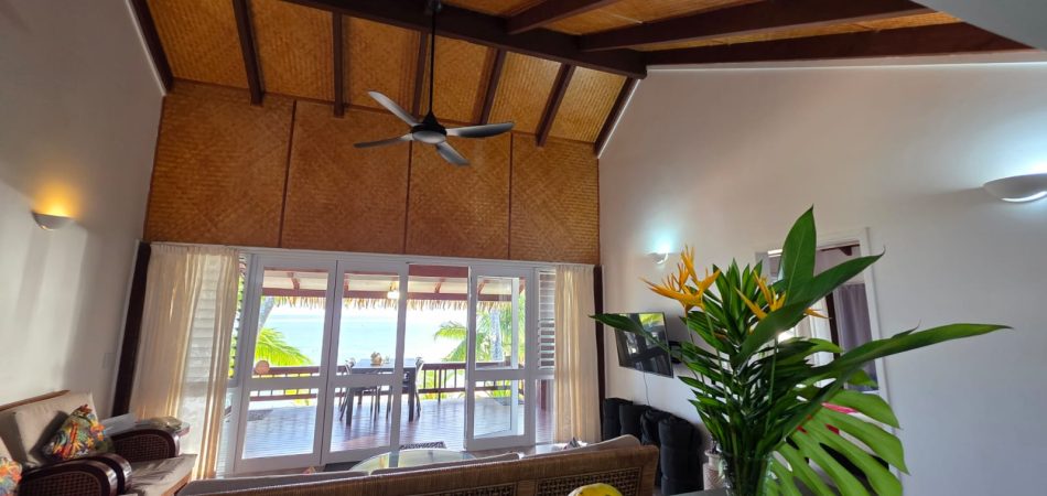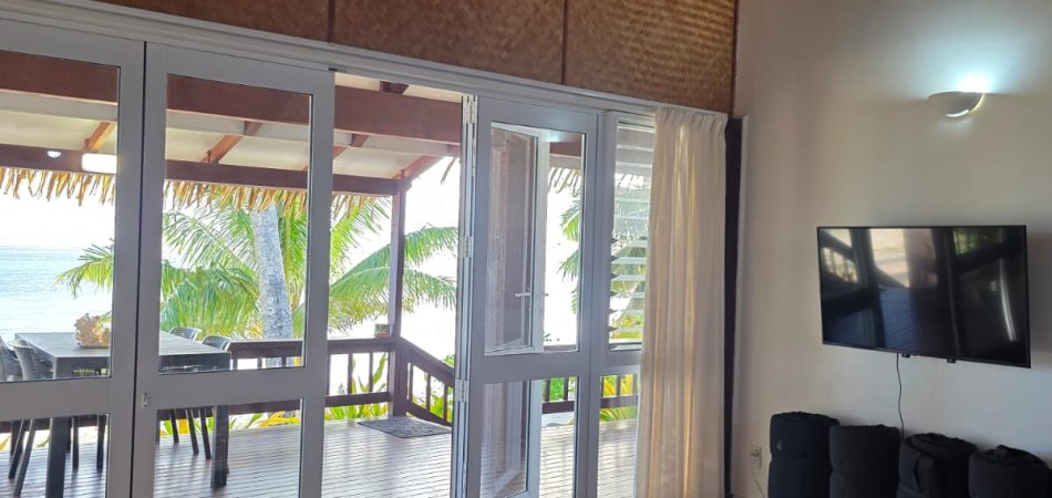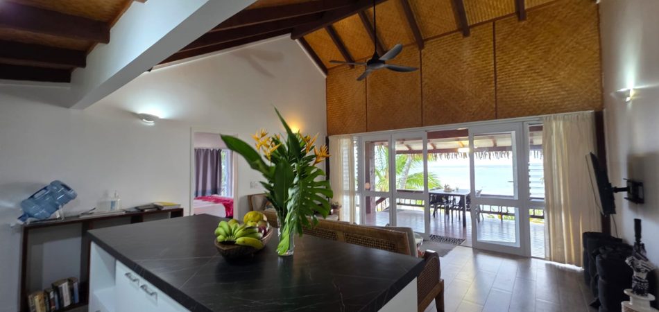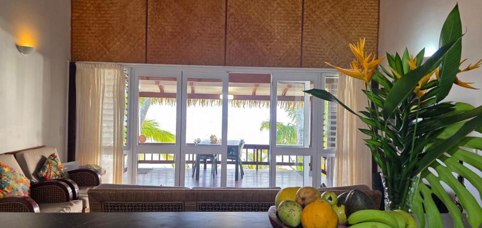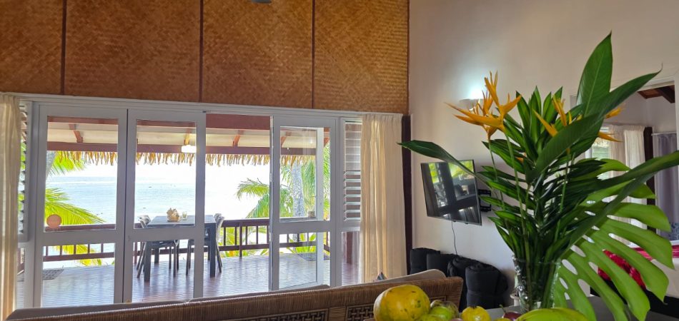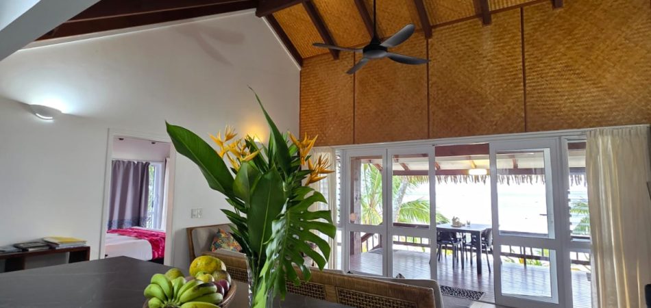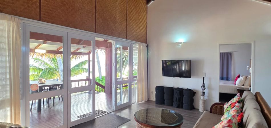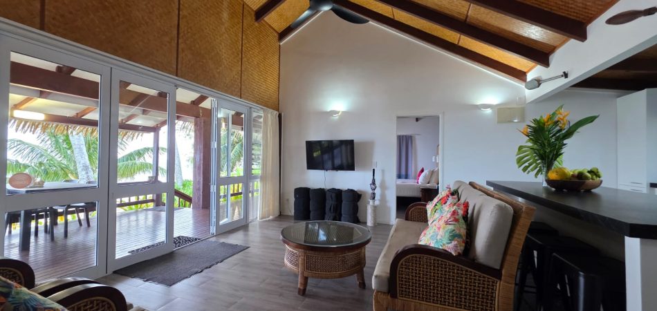 The living area extends directly onto a large covered verandah that runs the full width of the villa, right on the lagoon’s edge. This is where Iro’s Beach Villa truly comes into its own — the views are among the very best on the island, with uninterrupted outlooks across the turquoise waters of the Titikaveka lagoon.