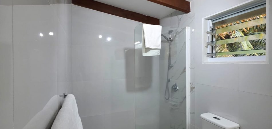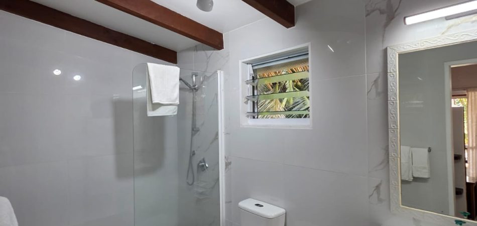 Both king-size bedrooms feature air-conditioning, ceiling fans, screened windows and direct lagoon views — so the setting follows you from the moment you wake up to the moment you fall asleep. Each bedroom has its own private ensuite with separate shower, toilet and vanity.